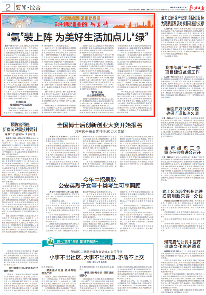 2021年9月,郑州城市群获批启动燃料电池汽车示范应用工作。省委省政府高度重视,决定由郑州市作为牵头城市,按照“全国一盘棋”统筹规划,开展燃料电池汽车示范应用,吸引产业链优势企业集聚,加快新能源汽车产业和氢能及储能未来产业的发展,助推河南省新能源汽车产业换道领跑。