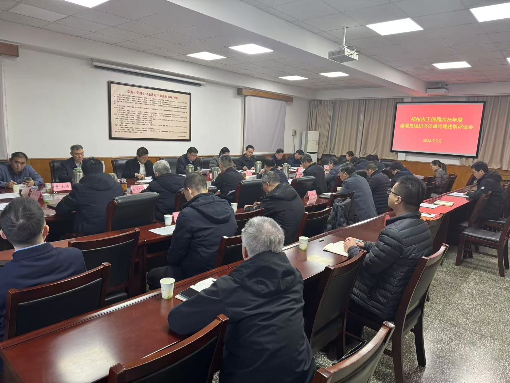 2月5日,郑州市工信局2025年度基层党组织书记抓党建工作述职评议考核会召开,深入学习贯彻习近平新时代中国特色社会主义思想和党的二十大及二十届历次全会精神,贯彻新时代党的建设总要求,总结2025年党建工作,安排部署2026年局系统党建重点任务。党组书记、局长张波主持会议并讲话。市委直属机关工委基层组织建设指导部副部长王豪佩到会指导。局领导班子成员出席会议。