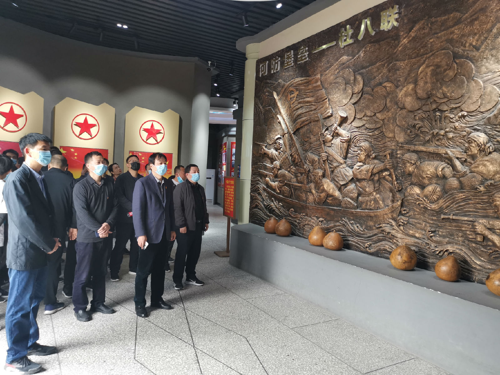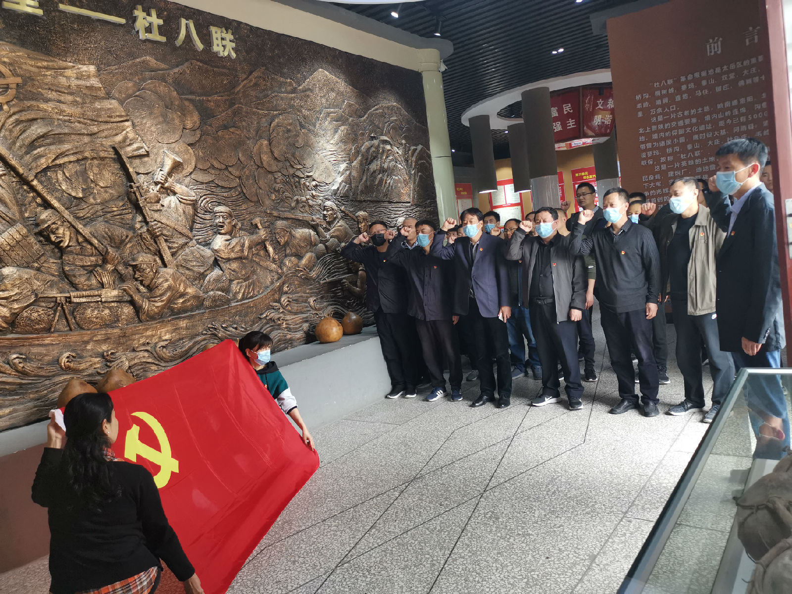 下午,同志们来到杜八联革命纪念馆参观学习,在杜八联纪念馆内,全体党员先后参观了黄河怒吼、众志成城、浴血奋斗、河防堡垒、战旗高扬、浩气长存六个展区,仔细观看了纪念馆内陈列的各种珍贵文物、文献、照片等资料,丰富鲜活的革命历史资料全面展示了先烈们的丰功伟绩,生动再现了敢于斗争、善于斗争、百折不挠、前仆后继的杜八联革命精神。在杜八联革命纪念馆雄伟壮观的浮雕前,全体党员面对党旗重温了入党誓词,再一次向党做出了庄严的承诺。